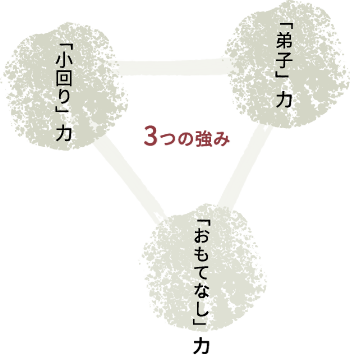 「弟子」力:清華堂で修行し、独立・家業復帰した「弟子」と組織体制をとっています。1人親方が多い業界の中、経験豊富な「弟子」が関西圏にいる支えが、大きな強みです。
