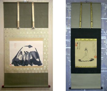 真の仕立は、一般に仏仕立てあるいは仏表具ともいいます。これは仏画(仏像・高僧像・祖師像・曼荼羅など)・お名号・お題目など仏教にかかわる書画の軸装に用いる様式です。行の仕立は、特に狭義の大和仕立や大和表具と別称があるように、純日本式の様式として最も広く用います。草の仕立は、形体として行の柱幅を狭くしたもので、茶掛として最も多く用いる様式です。